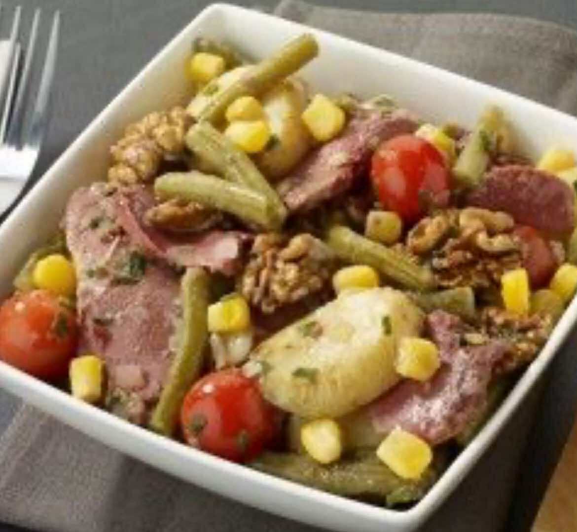 gésiers et magret de canard,haricots verts, noix, mais, tomates cerises.